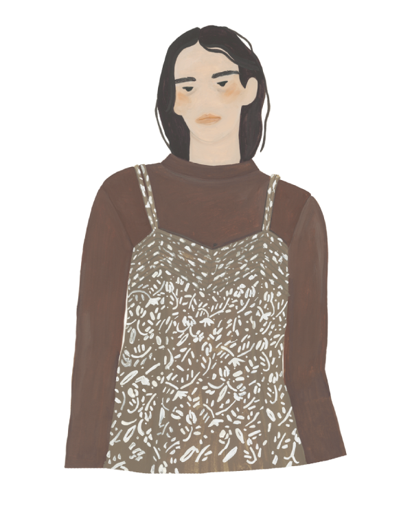ダークトーンのくすみブラウンに、グレージュワンピを重ねた穏やかな配色コンビ。 AUTUMNが得意とする、くすんだカラー同士の落ち着いた雰囲気には、サテンワンピのツヤと大人っぽい花柄で華やかさをトッピング。