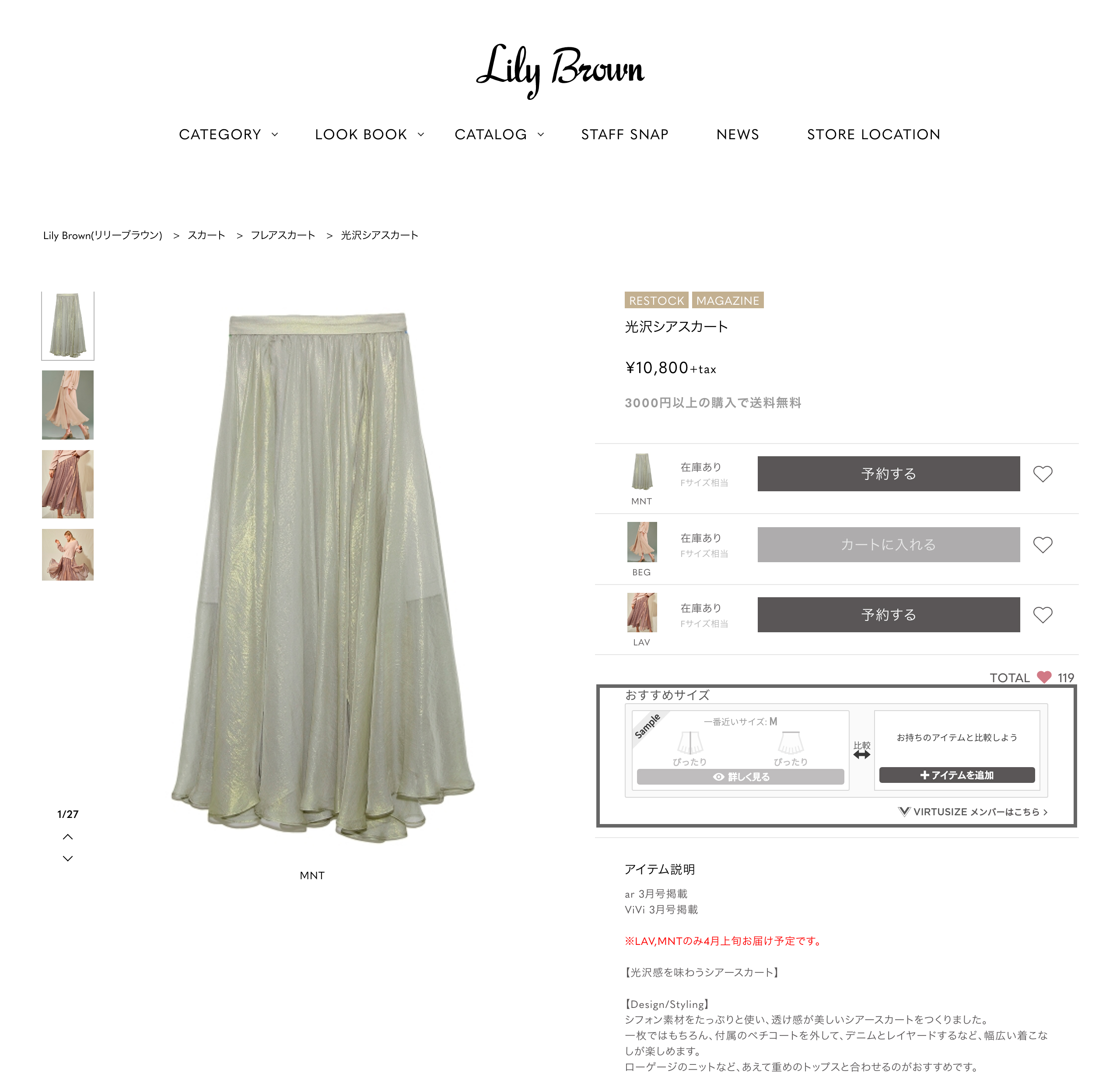 商品詳細ページに設置されている「サイズをチェック」ボタンをクリックすると、オンライン試着室が立ち上がり、見ているアイテムの画像とイラストが表示されます。