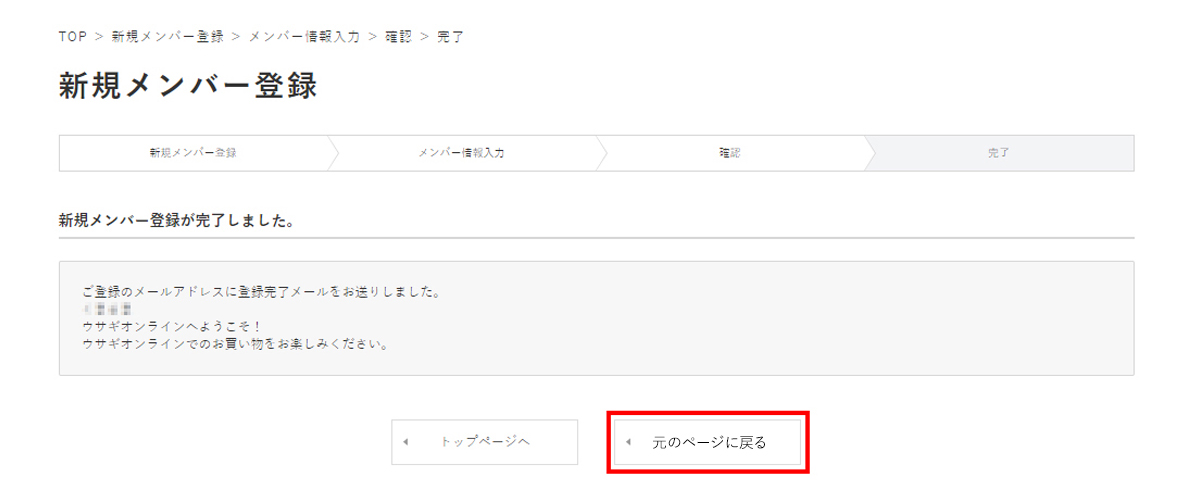 ③登録が完了しますとこちらのページになり元のページに戻るボタンを押すとクーポンが発行されます